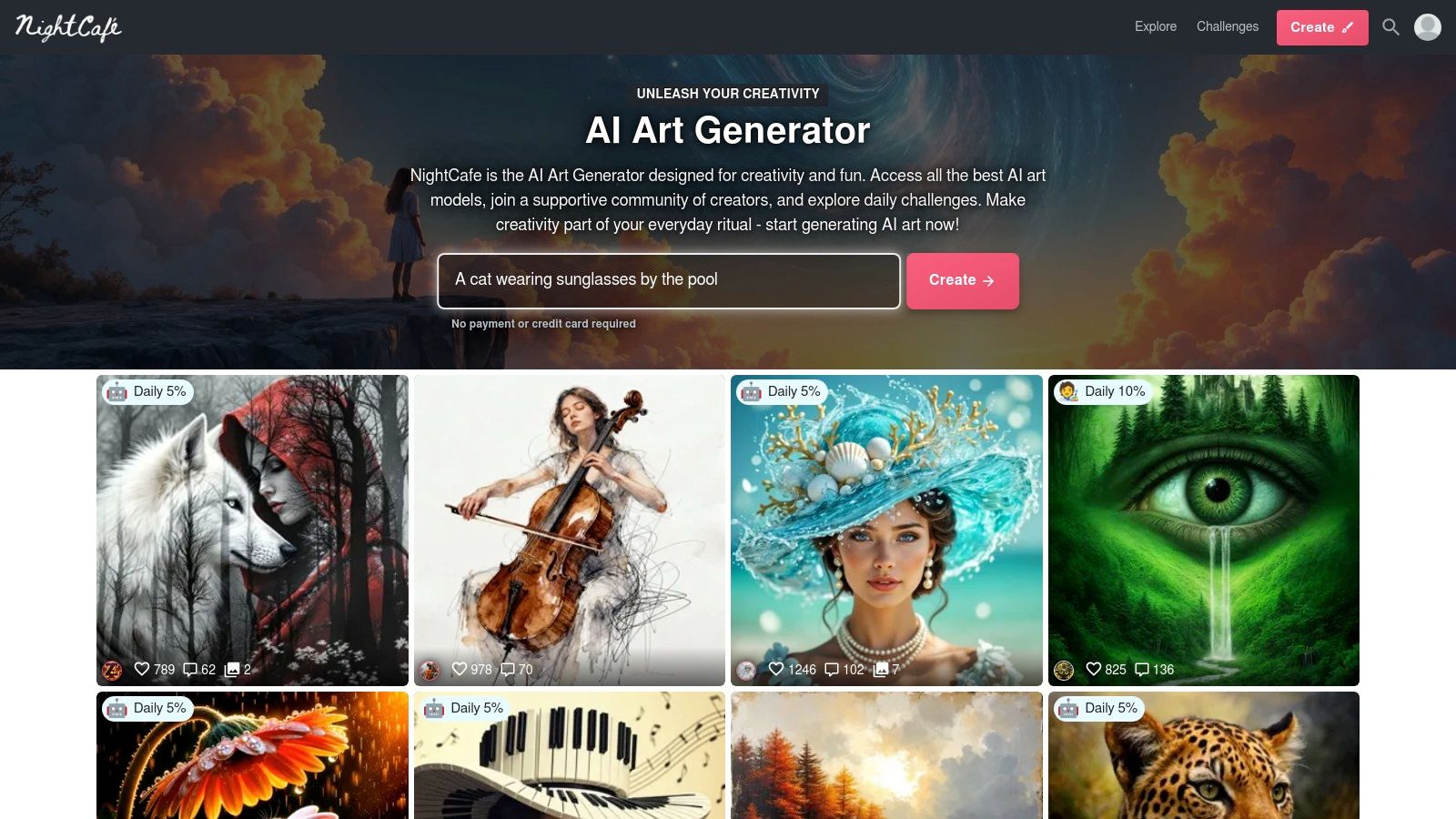 NightCafe operates on a credit system, providing five free credits daily that reset every 24 hours. For more intensive use, you can subscribe to a PRO plan, which offers a monthly credit allowance that rolls over, or purchase one-time credit packs.