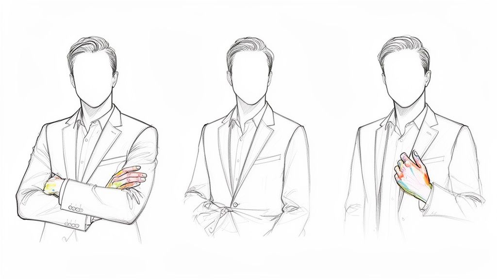 - Il gancio tascabile: Per un look più rilassato ma comunque curato, provate a infilare il pollice in una tasca. In questo modo, si acquisisce una disinvoltura che la nostra AI può replicare in vari contesti professionali.